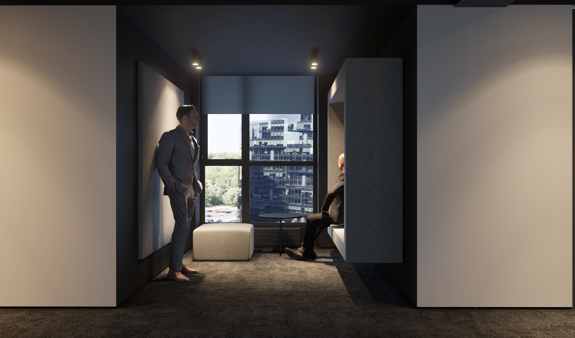 Новий офіс. Зона для неформальної бесіди. Монохром. Повсть та світло. New office. Area for informal Conversation. Monochrome. Felt and light.